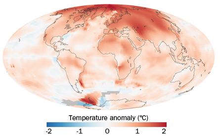 HOT TIMES Between 2000 and 2009, more of the globe warmed (red) than cooled (blue) compared with average temperatures from the baseline period 1951–1980.