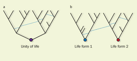 A new study uses statistics to test whether life on Earth can be traced back to a common ancestor (example shown in a) or multiple primordial life forms (b).