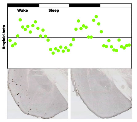LESS SLEEP, MORE PLAQUES Levels of amyloid-beta protein fluctuate over the day and night/sleep-wake cycle in the brain of a mouse genetically engineered to express the human amyloid precursor protein (top).