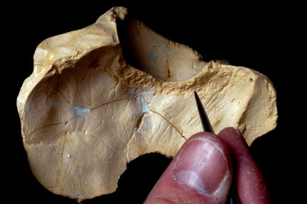 HOMO TUBERCULOSIS. A stippling of tiny pits (pointer) heralds a rare form of tuberculosis in this plaster cast of a skull fragment from a 500,000-year-old Homo erectus, claims one anthropologist.