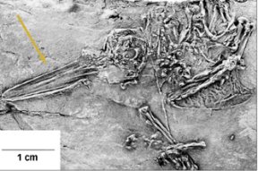 TINY BONES. Features of this ancient fossil, such as the long bill (arrow), vary little from those of modern hummingbirds.