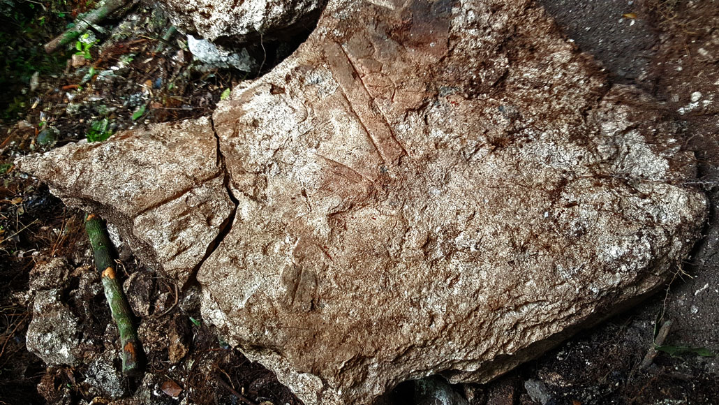WAR BURNS A fragment of an inscribed stone monument found at the Maya site of Witzna contains a dark, burned patch near its right edge. A 697 attack on Witzna left the monument broken and scorched, scientists say.