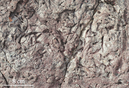 EARLY WORM Squiggles in this 530-million-year-old Californian rock come from the wormlike animal Arenicolites — the earliest evidence for creatures living in freshwater environments, scientists say.