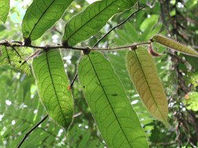 This small tree of the central Amazon, Hirtella myrmecophila, grows a pair of little pouches at the base of young leaves. Two-millimeter-long ants of the species Allomerus octoarticulatus move into the pouches.