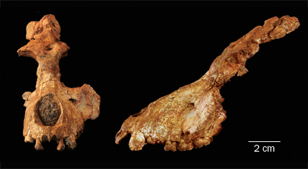 EVOLUTIONARY FIND Newly discovered pieces of an ancient primate skull, including a face and frontal braincase shown here from the front and side, suggest to scientists that Old World monkeys and apes diverged between 29 million and 24 million years ago.