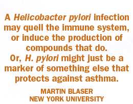 Blaser cautions that the association does not prove that an H. pylori infection prevents asthma, a chronic condition in which lung passages can become inflamed by contact with an allergen, smoke, pet dander or any number of other substances. Like allergies, asthma is an overreaction of the immune system to an innocuous substance.