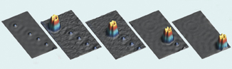 MOLECULAR PACMAN. A custom-made molecule (colored tower) gobbles dotlike atoms of copper protruding from a copper surface (left to right). Gross et al./Nature Materials