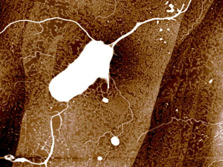 LIGHTNING BUGS The nanowires this deep-sea bacterium grows to search for food can carry electrons too, making it a candidate for applications in biotechnology.