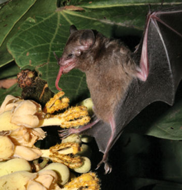 Like hummingbirds, South American long-tongued bats (Glossophaga soricina) hover at flowers and feed on sugar-rich nectar.