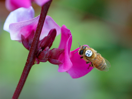 ADVENTUROUS BEES Honeybees that scout out new food sources (such as this tagged bee above) have biochemical signatures in their brains that suggest scouts are more adventurous than hive mates who aren’t scouts.