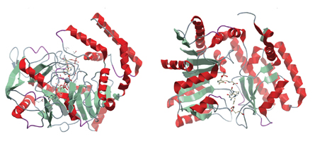 PROTEIN OF ALL TRADES, MASTER OF ONE A loyal and specific protein (left) that makes one kind of chemical reaction happen usually has a very important job in the cell.