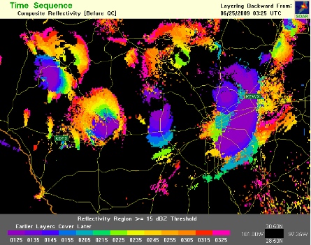 GOING BATS Radar images show masses of bats moving across the landscape (color bar below shows movements over time), giving biologists a sense of where swarms are moving.