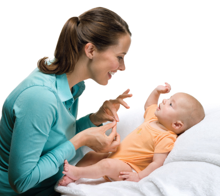 The well-known sing-along “Itsy Bitsy Spider” is one example of an action song that babies learn as they grow. In its first incarnation, up to about age 3 months, the infant lies down as the adult does all the work. Mom forms a spider hand, makes it crawl it up the baby’s body and tickles his or her chin at the “waterspout” ending of the first line. Mom spreads her fingers and runs them down the baby’s body for “down comes the rain.” At “out comes the sun,” mom places her spread fingers in front of the baby’s face. Gestures from the first line are then repeated with a final tickle.