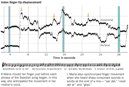 In a flash, the girl raises her left arm — an arm she has never seen — and begins conducting her mother’s performance. The baby, named Maria, moves her arm just before many of the song’s lines begin, leading her mother by about one-third of a second. In some cases, Maria synchronizes her hand movements with the rise and fall of her mother’s voice. Mom’s face glows in response to Maria’s playful directions.