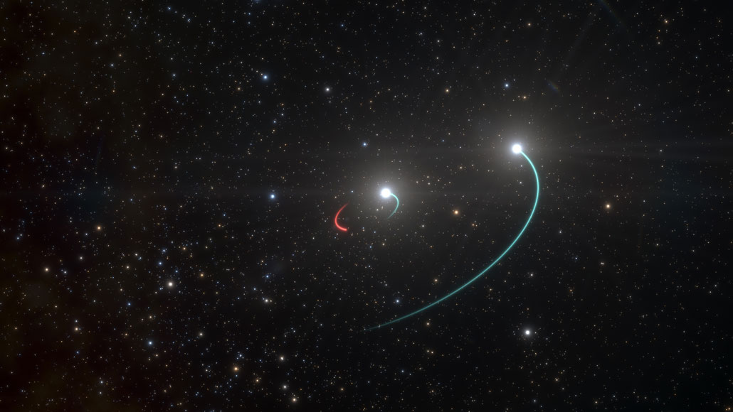 What appears to be the nearest black hole to Earth (orbit in red) was spotted thanks to two nearby massive stars (orbits in blue), shown in this artist’s impression.
