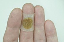 FUTURE FIRST AID. Prototype of a bandage containing a silicon sensor. Scientists are designing a sensor that would change color to show an infection.