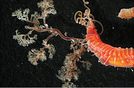 These marine relatives of earthworms and leeches come in a variety of forms. Some have adapted to zones of oxygen-starved ocean water and sport outsized structures that increase their body surface area for gas exchange. The species of terebellid polychaete shown above has enlarged, branched curlicues, or branchiae, that help it flourish in an oxygen-minimum zone 412 meters deep on the Pacific side of Costa Rica.