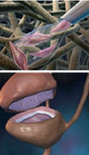 HOMEGROWN. Bladder and muscle cells thrive on a synthetic scaffolding (top), which surgeons then attach to the undamaged part of the original bladder (bottom).