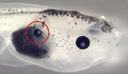 A tadpole has an extra eye growing in its gut (indicated with red circle) thanks to Tufts University scientists who manipulated electrical signals in gut cells to spark eye development.