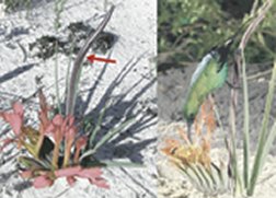 GET A GRIP. The thick green spear (arrow) without flowers in this South African rat tail plant (left) serves as a perch for a pollinating malachite sunbird (right).