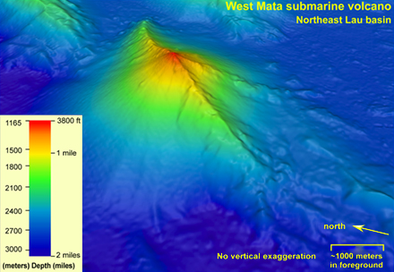 VOLCANIC DEEP An unmanned submersible recorded the deepest and most violent volcanic eruption yet observed. Image: NOAA by the remotely operated vehicle JasonSUMMIT DOWN LOW The summit of West Mata Volcano, shown in red, is nearly a mile below the ocean surface and its base, shown in blue, descends to nearly two miles deep.