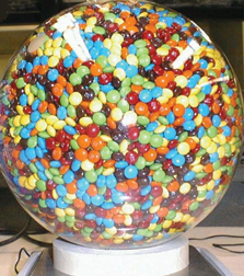 MEASURED INDULGENCE. Crammed willy-nilly into a flask, M&Ms pack together almost as compactly as do perfectly ordered spheres. A. Donev, et al./Science