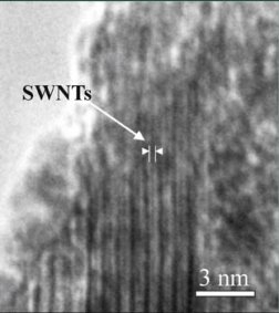Grown in the pores of zeolite crystals, these 0.4-nanometer carbon nanotubes (SWNTs) exhibit superconductivity. Z.K. Tang et al.