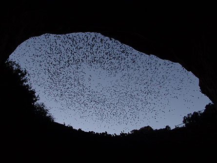 News Life Carlsbad’s 8 million ‘lost’ bats likely never existed Thermal imaging and algorithms challenge famous estimate By Susan Milius January 23, 2009 at 8:04 pm - More than 2 years ago Share this:Share Share via email (Opens in new window) Email Click to share on Facebook (Opens in new window) Facebook Click to share on Reddit (Opens in new window) Reddit Click to share on X (Opens in new window) X Click to print (Opens in new window) Print Eight million is a lot of bats to lose, and now a new unpublished study may explain what happened to the possibly lost bats of Carlsbad Cavern. EMERGING FROM DARKNESS A view of Carlsbad Cavern’s mouth shows bats swarming out to forage.