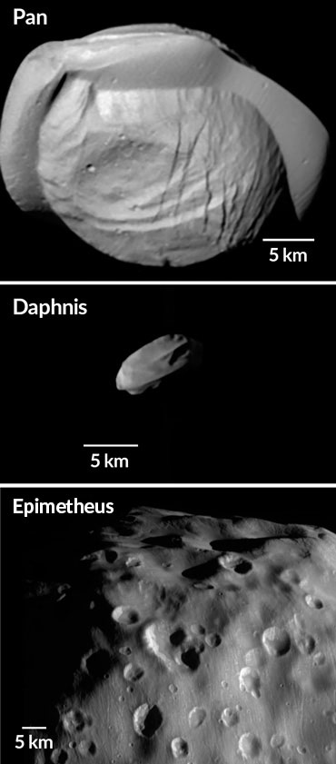 Cassini’s last flybys of five of Saturn’s ring-dwelling moons — including Pan, Daphnis and Epimetheus (below in gray-scale images) — showed that their colors varied with distance from the planet. That suggests they’re picking up ring debris, scientists say.