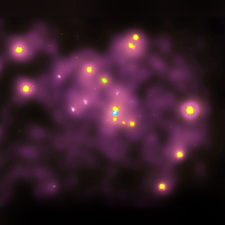 False-color X-ray image of the core of the Andromeda galaxy. Red indicates highest temperature (20 million kelvins), blue the lowest (1 million K).