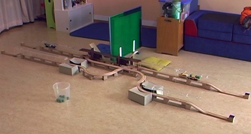 TRAIN GAINS Pairs of 5-year-olds who steered toy trains in this set-up often decided to take turns swerving their vehicles so that each child could alternately earn big rewards.