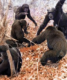 MAKING COPIES. New research suggests that chimps copy one another to spread tool-use traditions, such as using plant stems to dip for ants in a nest hole. D. Bygott