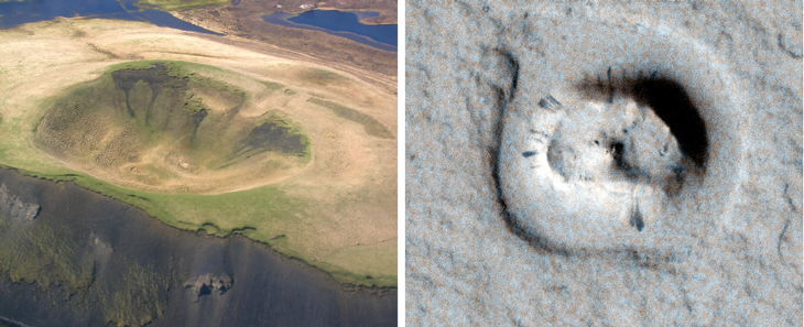 Mars has similar terrain. Early images of the Red Planet suggested that the ground was littered with rootless constructs, offering tantalizing clues to the planet’s watery past. Hamilton made the study of these features the focus of his Ph.D. research at the University of Hawaii at Manoa.