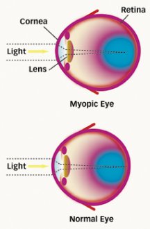 ODD EYES. Elongated, myopic eyeball (top) focuses light in front of the retina, making distant images appear blurry.