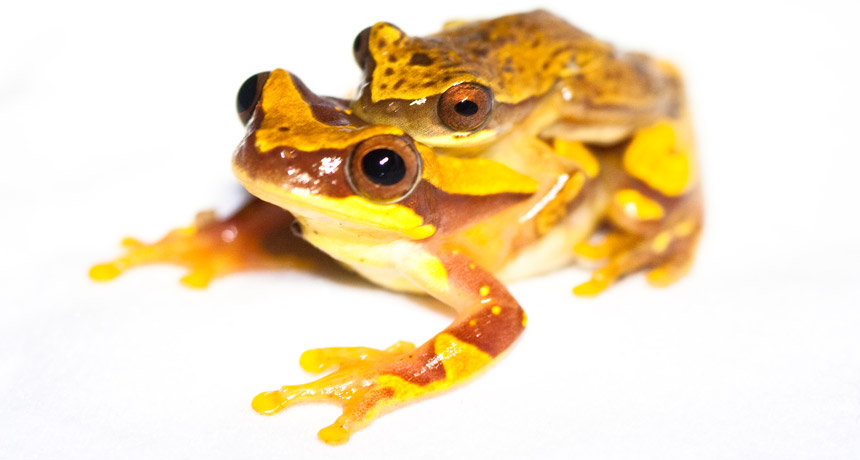 LIFE CHANGES Pantless treefrogs, the first frog species found that can deposit eggs either in water or out of it, might be able to adjust reproductive strategies if climate change disrupts local rainfall.