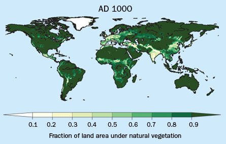 Caption: By the year 1000, humans had already cleared much land across the globe, for agriculture and other uses. In this computer simulation, darker greens signify higher levels of natural vegetation. Kaplan et al/The Holocene 2011
