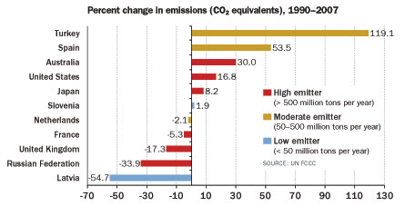 But 18 of the 40 industrial nations now spew more greenhouse gases than they did in 1990 — some of them substantially more, according to a U.N. report released October 21. The United States, for instance, releases about 17 percent more now than it did in 1990. Percentage increases for emissions by Spain, Australia, Canada and several others are higher still. And China, classified as a developing country and thus exempted by the treaty from having to make emissions reductions, recently surpassed the United States as the leading emitter of greenhouse gases.