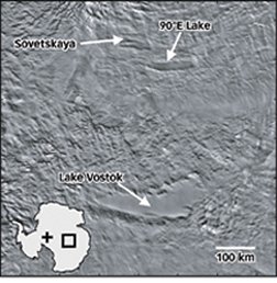 GREAT LAKES. Lake Vostok and the newly described 90°E and Sovetskaya Lakes lie beneath a kilometers-thick blanket of ice.