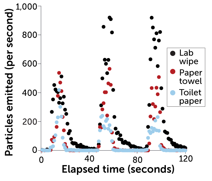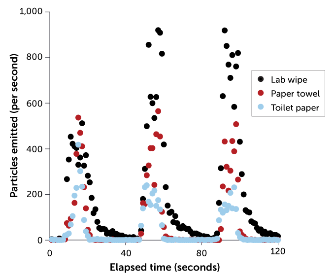 Some common items people use could be potential vehicles to spread respiratory viruses via aerosolized fomites, or dust kicked up from contaminated surfaces. The graph shows the number of particles emitted per second over time when rubbing together pieces of toilet paper (blue), paper towel (red) and lab wipes (black) to produce dust.