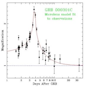 The amplification of the afterglow of a gamma-ray burst (data points; uncertainty shown as bars) fits the curve predicted for the effect of a gravitational lens.