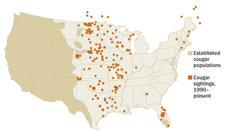 Once found throughout the United States, breeding populations of cougars are now restricted to the American West and the swamps of southern Florida. Preferring to avoid humans, Puma concolor seeks large territories with an abundance of its favorite prey — which include white-tailed deer and porcupines. Young males seeking territories and mates are increasingly heading eastward into their ancestral range and leaving behind hints of their presence.