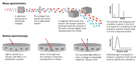 One light-tickling technique can analyze bottled samples without opening the bottle. It’s a play on Raman spectroscopy, in which a laser beam set to one wavelength, or color, is shined on a sample. A small number of photons from the beam will send the sample’s molecules oscillating like a spring, emitting light of a different color, which when analyzed yields a chemical bar code.