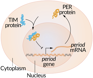 It wasn’t immediately apparent how the gene regulated fruit fly activity. In 1990, Hall and Rosbash determined that levels of period’s messenger RNA — an intermediate step between DNA and protein — fell as levels of period’s protein, called PER, rose. That finding indicated that PER protein shuts down its own gene’s activity.