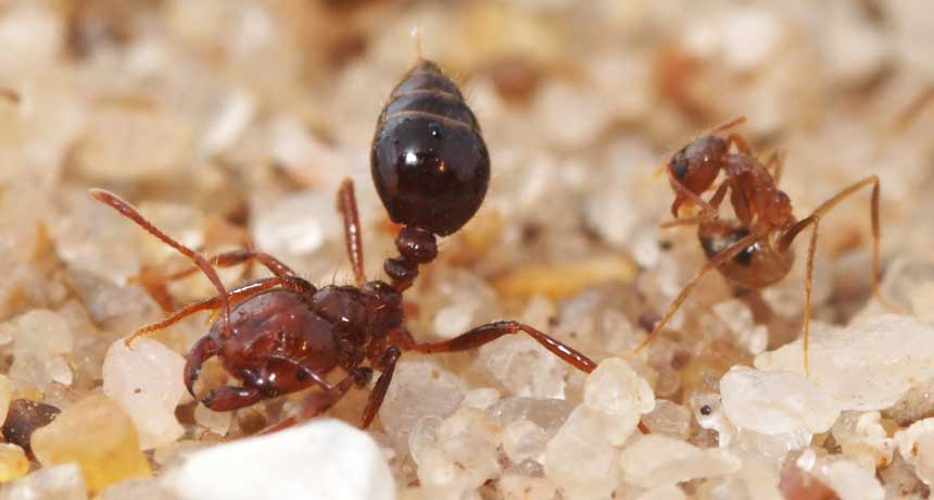 CHEMICAL ANT FIGHT The red imported fire ant (left) dabs droplets of potent venom from its rear onto enemies, but its opponent this time, a tawny crazy ant (right), detoxifies the venom with an acid rubdown.