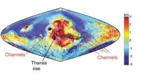 There’s additional evidence that the development of the Tharsis rise introduced and helped maintain liquid water on the surface of Mars, Phillips and his collaborators note. A detailed examination of Martian topography suggests that the planet’s network of channels, which resemble dried-up river beds on Earth, didn’t form until after the Tharsis rise was created. That’s the best explanation for the orientation of the channels, because the birth of Tharsis could have provided both the water for the channels and the slope those channels had to follow, says Philips. The channels in both the Tharsis region and the Arabia bulge follow the highs and lows induced by the Tharsis rise rather than older contours of the planet at large.