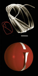 WITH A TWIST. A single-crystal Möbius strip (top micrograph) forms when a crystal ribbon grows around a selenium droplet (bottom illustration).