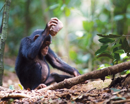 A juvenile male chimpanzee in a western Africa forest cracks Coula nuts with a rock.
