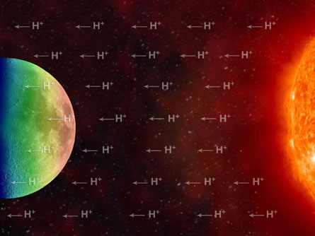 GO WITH THE FLOW This illustration shows one scenario to account for the newly discovered water on the moon’s surface. When a stream of hydrogen ions carried from the sun (extreme right) by the solar wind hits the moon (extreme left), it may liberate oxygen from lunar material to form water.