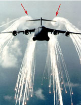 BACK OFF. Smoke from flares dropped by this Air Force C-17 transport highlights the swirling vortices (red arrows) trailing it.