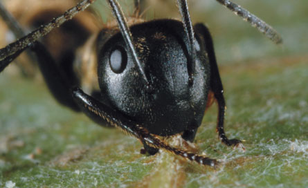 This ant, turned into a kind of zombie by a fatal fungus infection, has taken its final death-grip bite into a leaf vein and merely twitches slightly instead of attacking when an interloper scurries over.